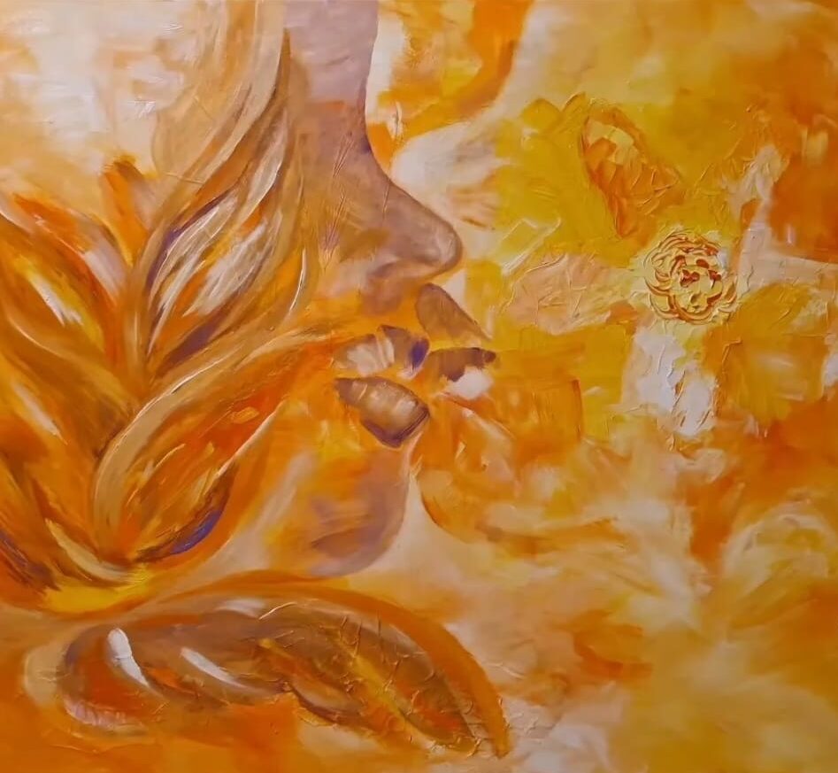 In leuchtenden Gelb- und Orangetönen entfaltet sich eine weiche, fließende Bildsprache, die an Blüten, Atem und Berührung erinnert. Die Formen scheinen sich sanft zu begegnen – wie ein Kuss zwischen Mensch und Natur.